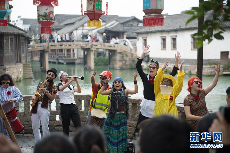 10月26日,一個劇團在烏鎮(zhèn)街頭表演。 新華社記者翁忻旸攝