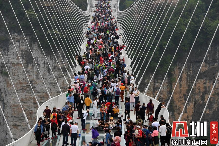 2019年4月24日,湖南張家界大峽谷玻璃橋上,游客們擺出各種姿勢拍照。剛開始,游客們在短暫的恐懼之后,隨之而來的是滿滿的興奮,男女老少紛紛在這座懸在300多米高空中的全透明玻璃橋上不停拍照,從一開始走上橋緊張的不敢踩在玻璃上,到最后在玻璃橋上的各種躺和趴,各種姿勢各種創(chuàng)意各種拍攝,游客們完全忘我地開心游玩。張家界大峽谷玻璃橋,是世界首座斜拉式高山峽谷玻璃橋,玻璃橋全長430米,寬6米,橋身距離谷底垂直落差300米,大橋表面由99塊透明玻璃鋪設而成,整個工程無鋼筋混凝土橋墩。