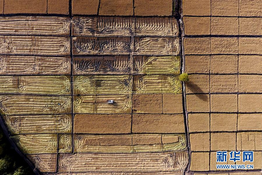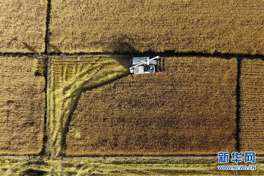 收割機(jī)在太原市晉源區(qū)赤橋村稻田里作業(yè)(10月28日無人機(jī)拍攝)。新華社記者詹彥攝