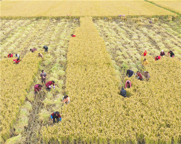 2019年10月26日,江蘇省宿遷市泗洪縣在稻米小鎮(zhèn)石集鄉(xiāng)舉行具有地方特色的割稻比賽,近60名選手在金色稻田揮舞銀鐮、緊張角逐。張連華/視覺中國