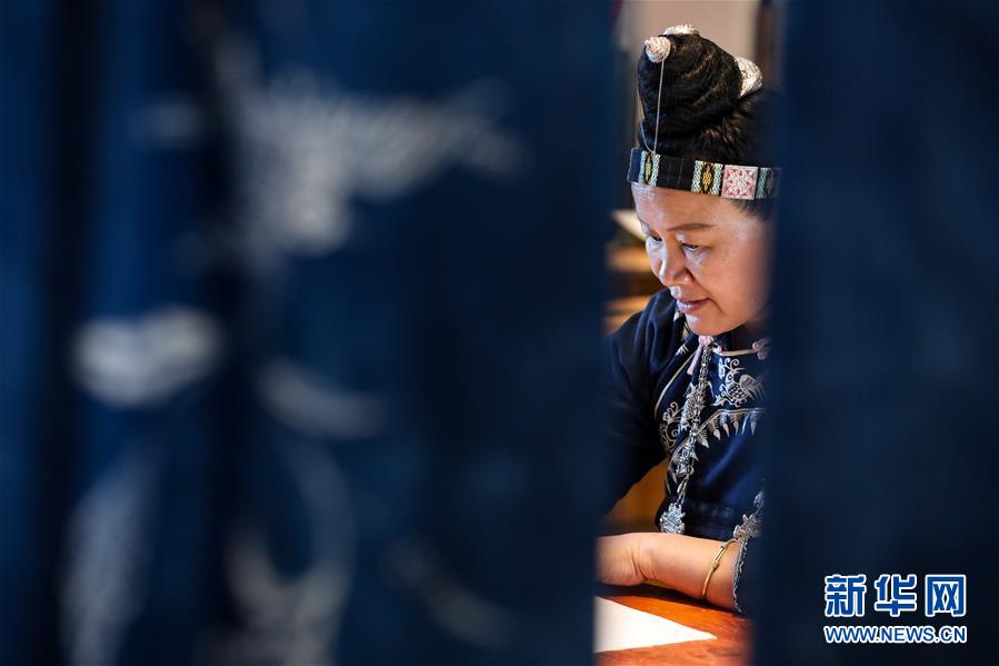 10月29日,楊芳在位于丹寨萬達(dá)小鎮(zhèn)內(nèi)的工作室內(nèi)繪制蠟染圖案。新華社記者 歐東衢 攝