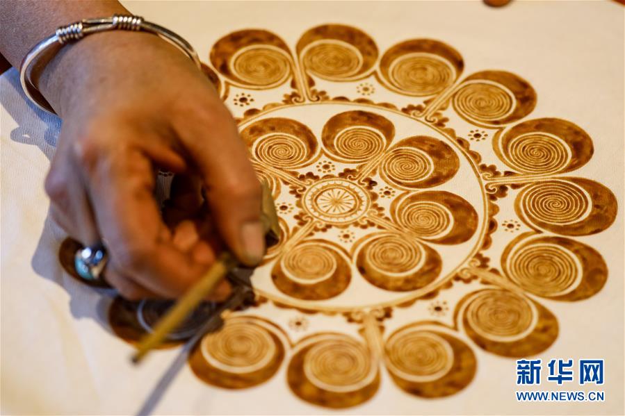 10月28日,楊芳在用蜂蠟繪制蠟染圖案。新華社記者 歐東衢 攝