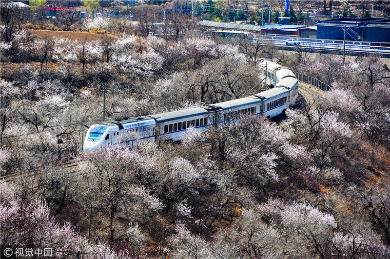 2019年3月22日,北京居庸關(guān)附近的山花盛開(kāi),S2線列車穿行在花海之中,構(gòu)成一幅美麗的畫面。