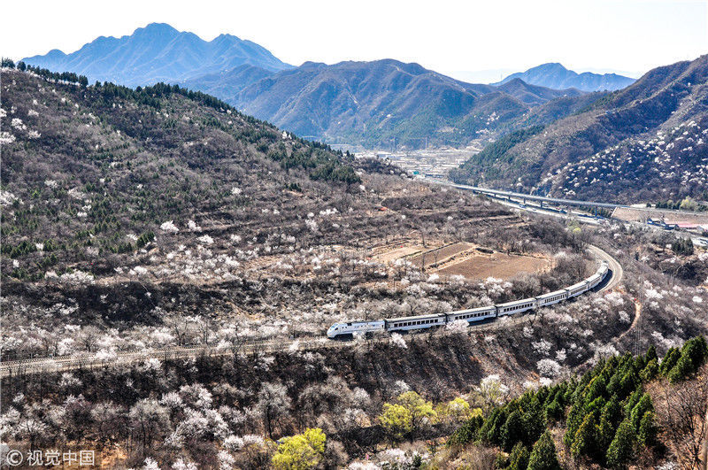 2019年3月22日,北京居庸關(guān)附近的山花盛開,S2線列車穿行在花海之中,構(gòu)成一幅美麗的畫面。