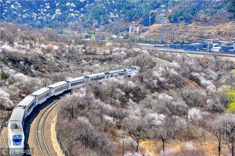 2019年3月22日,北京居庸關(guān)附近的山花盛開(kāi),S2線列車穿行在花海之中,構(gòu)成一幅美麗的畫(huà)面。