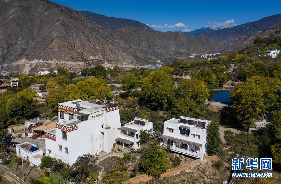 10月29日,四川省鄉(xiāng)城縣的定曲河峽谷的青德鄉(xiāng),民宿“皈院”錯(cuò)落有致,保留白藏房傳統(tǒng)民居特色(無人機(jī)拍攝)。新華社記者江宏景攝