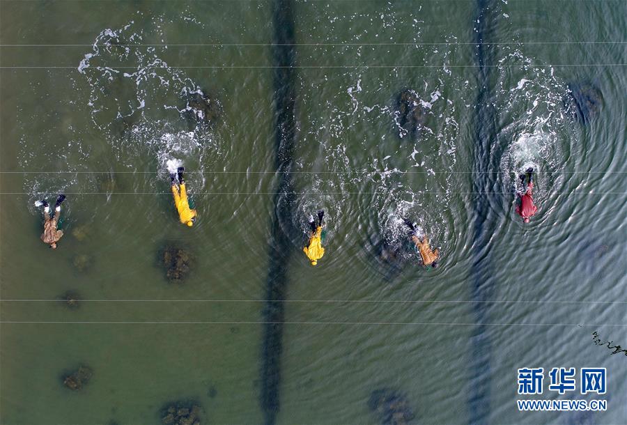 樂亭縣姜各莊鎮(zhèn)一處海參養(yǎng)殖基地的工人在捕撈海參(10月30日無人機(jī)拍攝)。