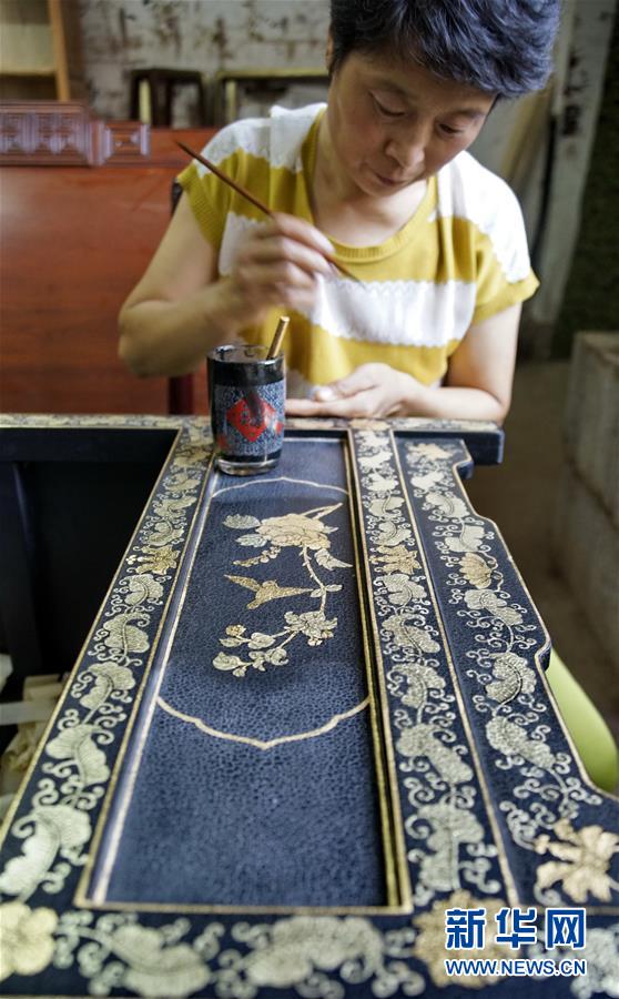 北京金漆鑲嵌有限責(zé)任公司的技師運(yùn)用貼金描漆的技藝制作屏風(fēng)(10月31日攝)。新華社記者李欣攝