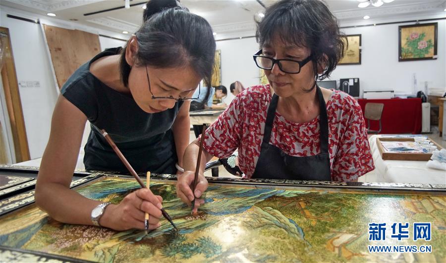 北京金漆鑲嵌有限責任公司工藝美術大師胡昕(右)在向學生傳授漆畫技藝(9月19日攝)。新華社記者李欣攝