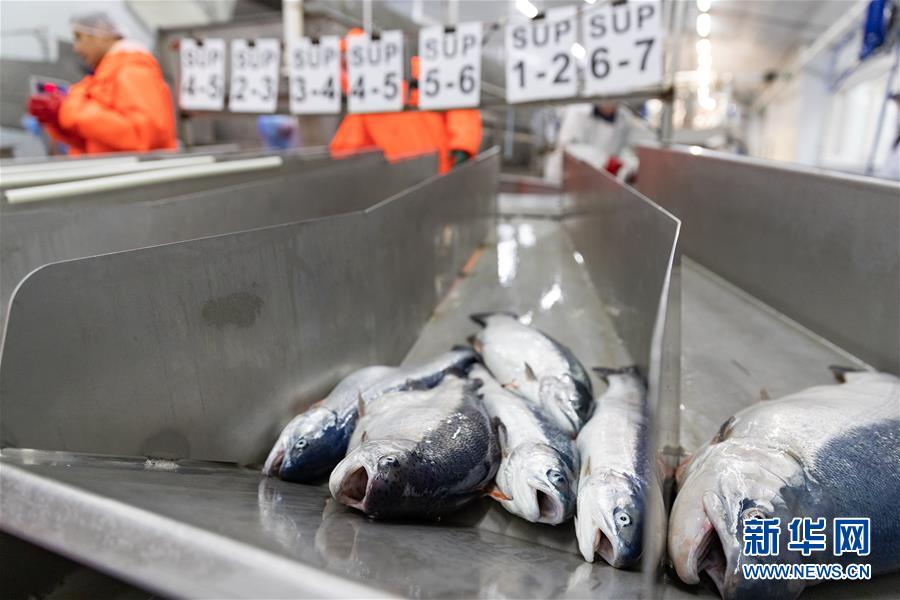 9月13日,在俄羅斯摩爾曼斯克,俄羅斯水產(chǎn)養(yǎng)殖公司工作人員在車間處理鮭魚。 新華社記者白雪騏攝