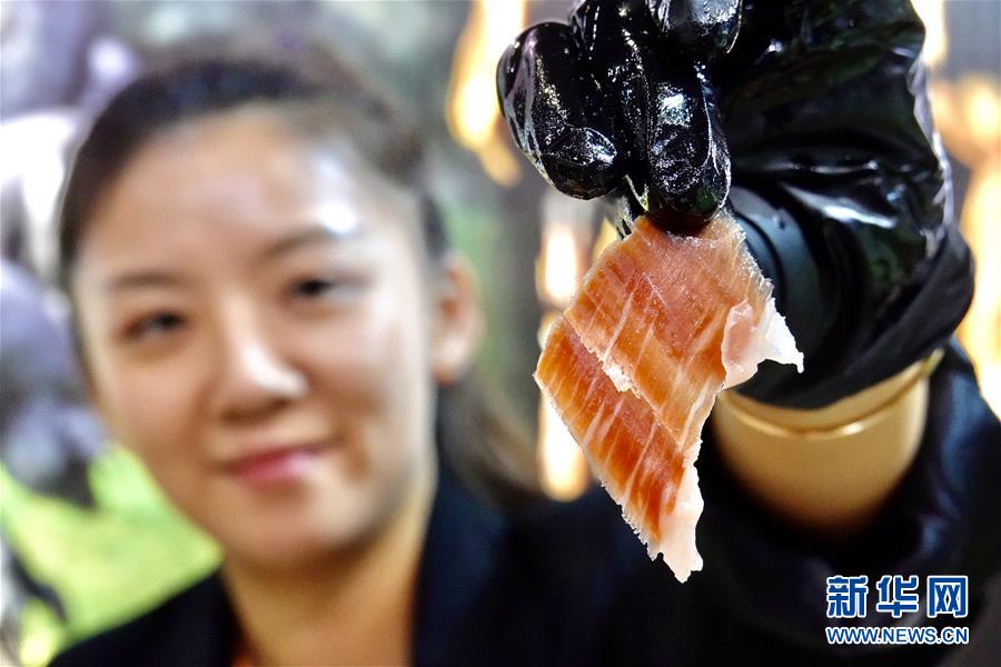 11月5日,在第二屆進博會食品及農產品展區(qū),工作人員展示西班牙橡果火腿。新華社記者才揚攝