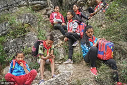 5月14日是家長接孩子的日子,清晨6點(diǎn)多,30多歲的陳古吉帶著背包繩和另外兩個(gè)家長一起下山接孩子。村里身手敏捷的年輕人,下山通常需要1小時(shí),上山大約90分鐘,對于外來的人,通常是這個(gè)時(shí)間的兩倍。 圖片來源:視覺中國