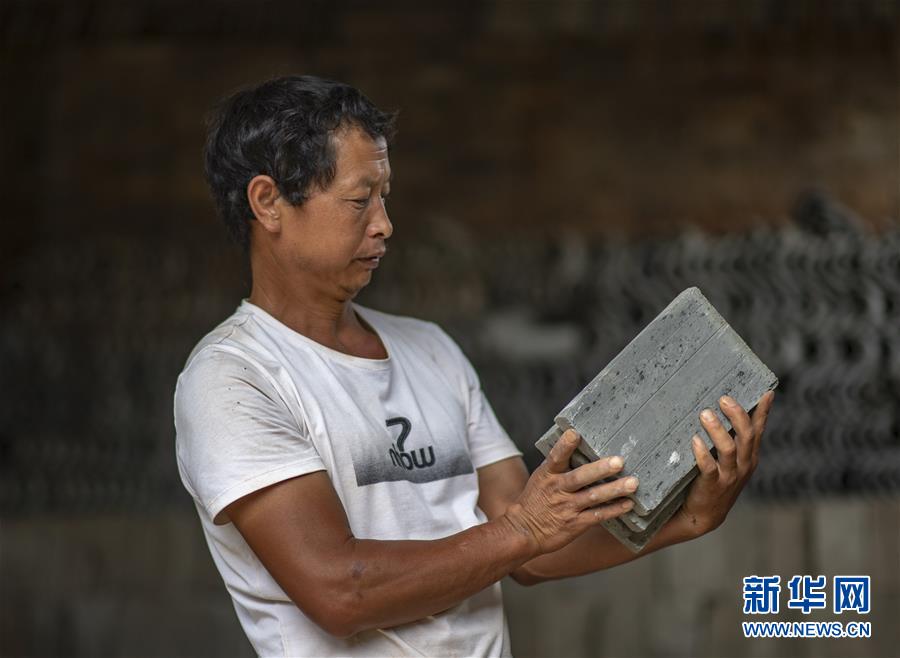 石屏縣異龍鎮(zhèn)符家營(yíng)村村支書楊松在挑選準(zhǔn)備用于修繕老屋的地磚(8月8日攝)。新華社記者江文耀攝
