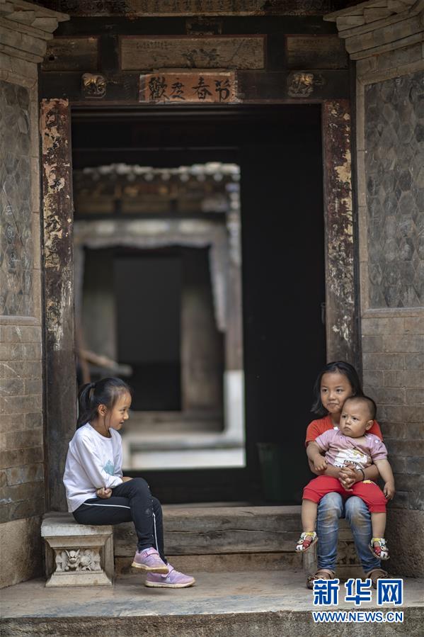 石屏縣異龍鎮(zhèn)符家營(yíng)村的小朋友鄭淇(左)與小伙伴在村里的老屋門前休息(8月8日攝)。新華社記者江文耀攝