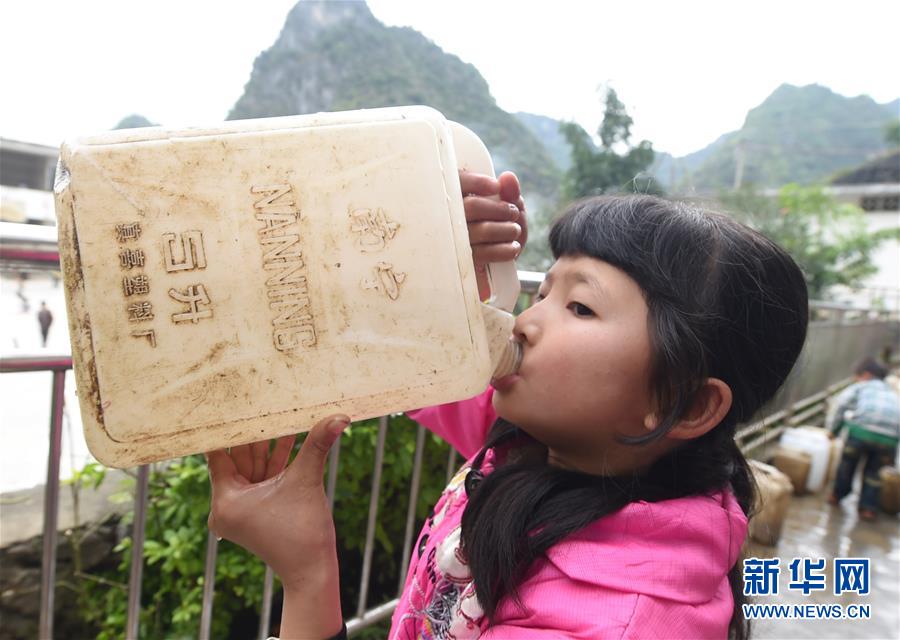 在廣西大化瑤族自治縣板升鄉(xiāng)八好小學(xué),一名學(xué)生喝水桶里的雨水(2014年11月24日攝)。八好小學(xué)有400多名學(xué)生,曾僅有一個(gè)不足100立方米的水柜,用于收集儲(chǔ)存樓頂?shù)挠晁?,學(xué)生需定期定量用水。遇到長時(shí)間不下雨,學(xué)校需要到鄉(xiāng)政府所在地運(yùn)水。如今,學(xué)校修建了5個(gè)大水柜,并從兩公里外引泉水到校園,飲水難問題得到解決。新華社記者黃孝邦攝