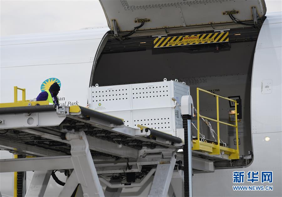 11月19日,在美國(guó)華盛頓附近的杜勒斯國(guó)際機(jī)場(chǎng),裝有大熊貓“貝貝”的箱子被運(yùn)上飛機(jī)。 新華社記者 劉杰 攝