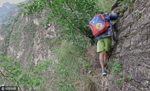 上學(xué)的孩子都背著沉沉的書包,大多數(shù)是女孩,15個(gè)孩子在三個(gè)家長的保護(hù)下,大約用了2個(gè)小時(shí),到達(dá)“懸崖村”。上山容易下山難,遇到雨雪天氣,村里人就不再外出了。圖片來源:視覺中國