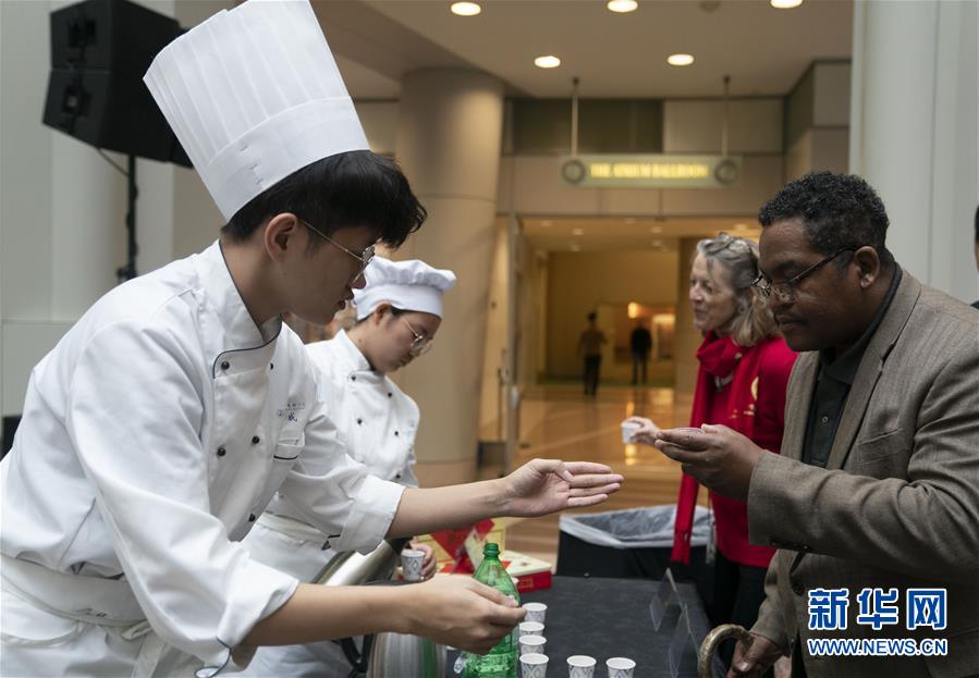 11月22日,在美國(guó)華盛頓,人們?cè)凇氨本┤铡蔽幕瘡R會(huì)活動(dòng)上品嘗中國(guó)小吃。作為中國(guó)北京和美國(guó)首都華盛頓締結(jié)友好城市35周年慶祝活動(dòng)的一部分,“北京日”文化廟會(huì)22日在華盛頓羅納德·里根大廈和國(guó)際貿(mào)易中心舉行。新華社記者劉杰攝