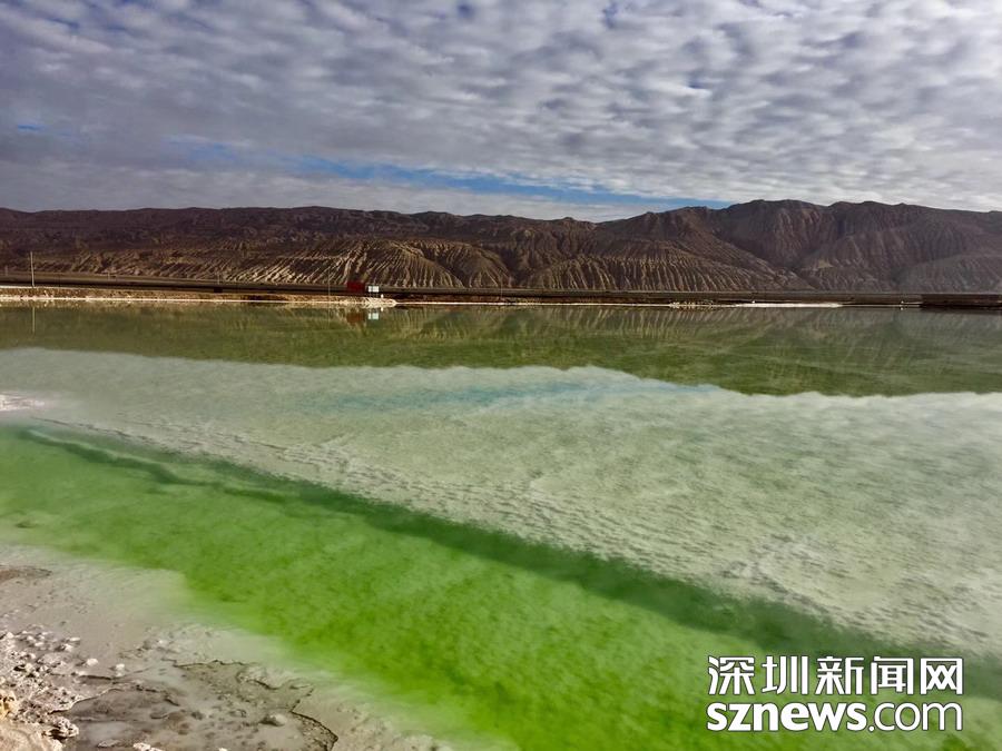 在青海柴達木盆地最西部的茫崖有一處硫酸鎂亞型人工鹽湖,以其翡翠綠色的鹽田與藍天白云和附近的丹霞地貌相映。李仁奇攝
