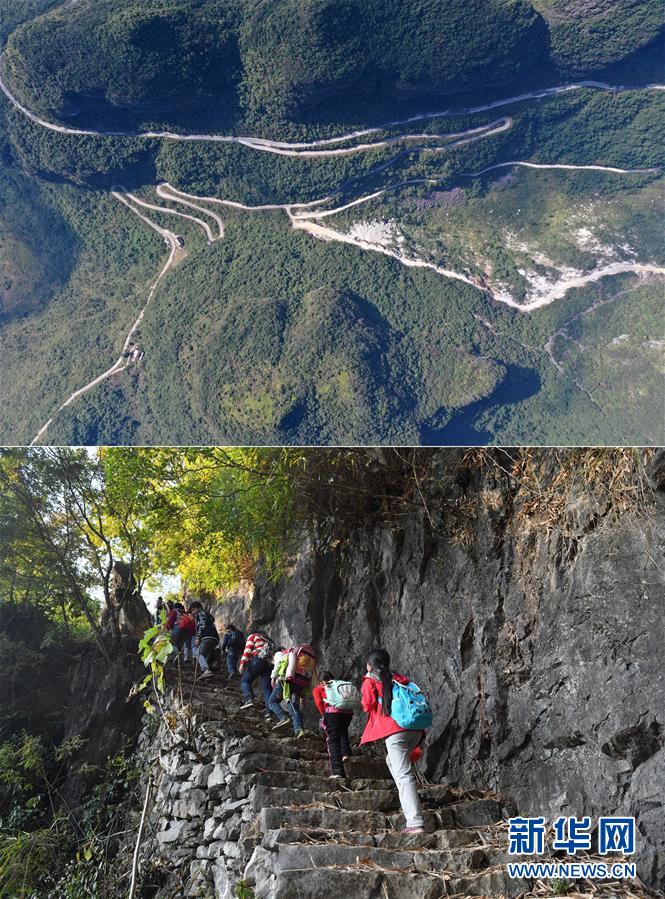 拼版照片:上圖為大化瑤族自治縣七百弄鄉(xiāng)弄良村弄丘屯剛剛修通的公路(右下段)和村道、鄉(xiāng)道連接(11月12日無人機拍攝);下圖為在尚未通路的弄良村弄丘屯,孩子們爬“天梯”回家(2016年12月9日攝)。新華社記者黃孝邦攝