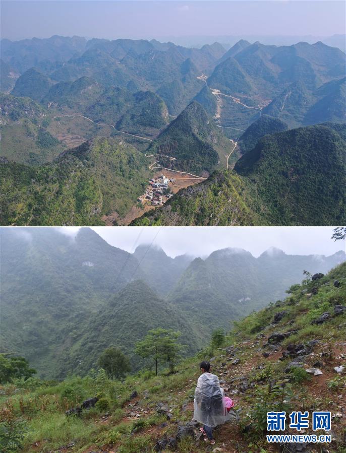 拼版照片:上圖為已經(jīng)修通公路的大化瑤族自治縣板升鄉(xiāng)弄勇村各自然屯(11月11日無人機拍攝);下圖為在弄勇村弄炮屯,一名小學生爬山路去學校(2016年9月1日攝)。新華社記者黃孝邦攝