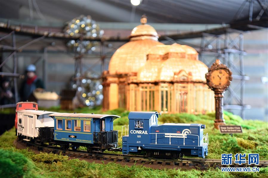 11月26日,在美國紐約植物園節(jié)日小火車展上,一輛模型小火車駛過紐約植物園溫室微縮模型。