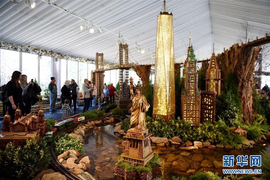 11月26日,在美國(guó)紐約植物園節(jié)日小火車(chē)展上,游客觀看自由女神像和曼哈頓高樓微縮模型。新華社記者韓芳攝