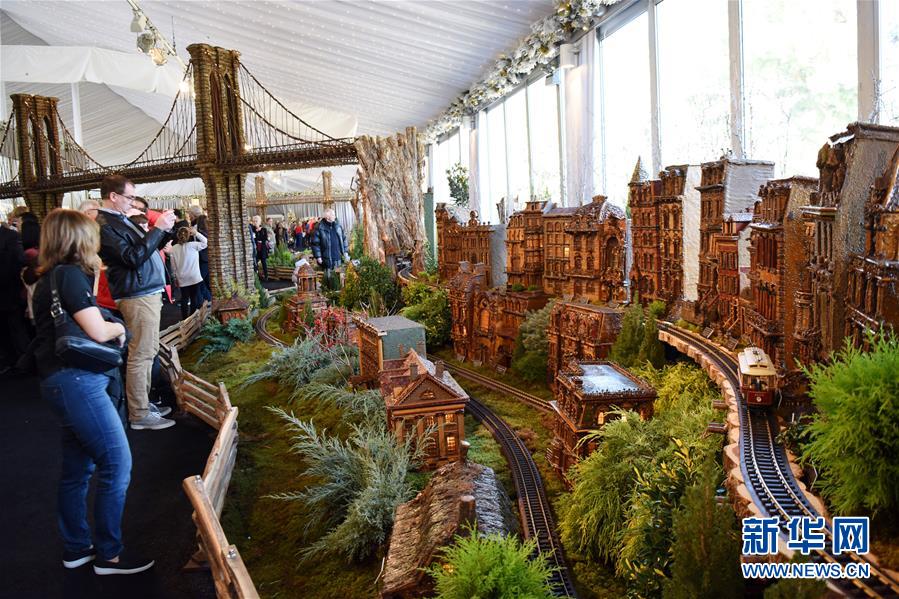 11月26日,在美國(guó)紐約植物園節(jié)日小火車(chē)展上,游客觀看模型小火車(chē)和紐約微縮景觀。新華社記者韓芳攝