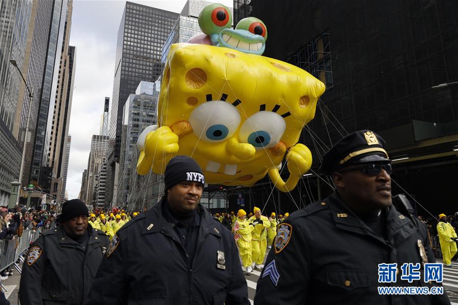 11月28日,在美國紐約舉行的感恩節(jié)大游行上,卡通氣球行進(jìn)在曼哈頓街頭。 新華社記者 李木子 攝