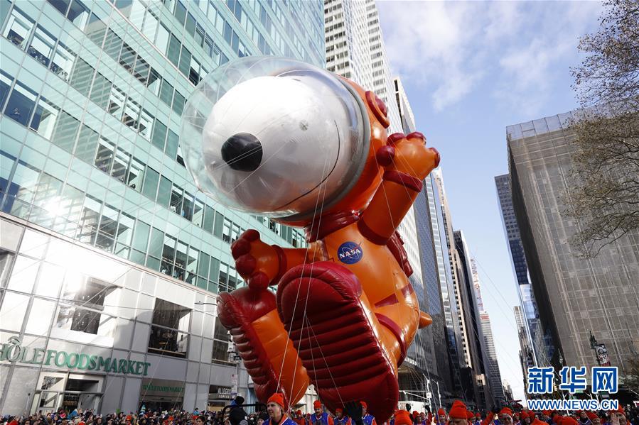11月28日,在美國(guó)紐約舉行的感恩節(jié)大游行上,卡通氣球行進(jìn)在曼哈頓街頭。 新華社記者 李木子 攝