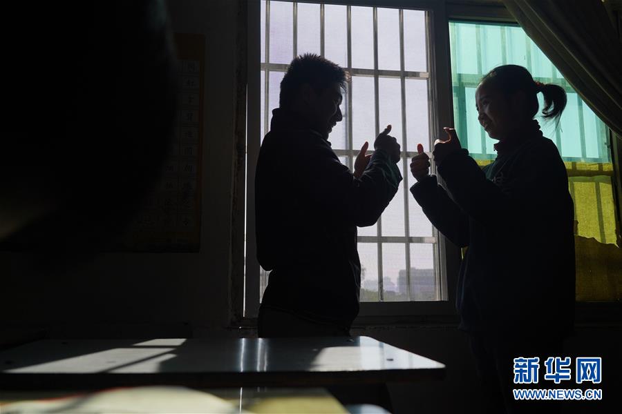 在江西省南昌市三聯(lián)特殊教育學(xué)校,兩名學(xué)生在課后練習(xí)手語(11月22日攝)。