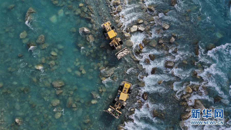 在新疆塔什庫(kù)爾干塔吉克自治縣大同鄉(xiāng)庫(kù)如克欄桿村,電力工人利用施工車輛運(yùn)送水泥、鐵塔零件過(guò)河,為鋪設(shè)線路做準(zhǔn)備(11月24日無(wú)人機(jī)拍攝)。
