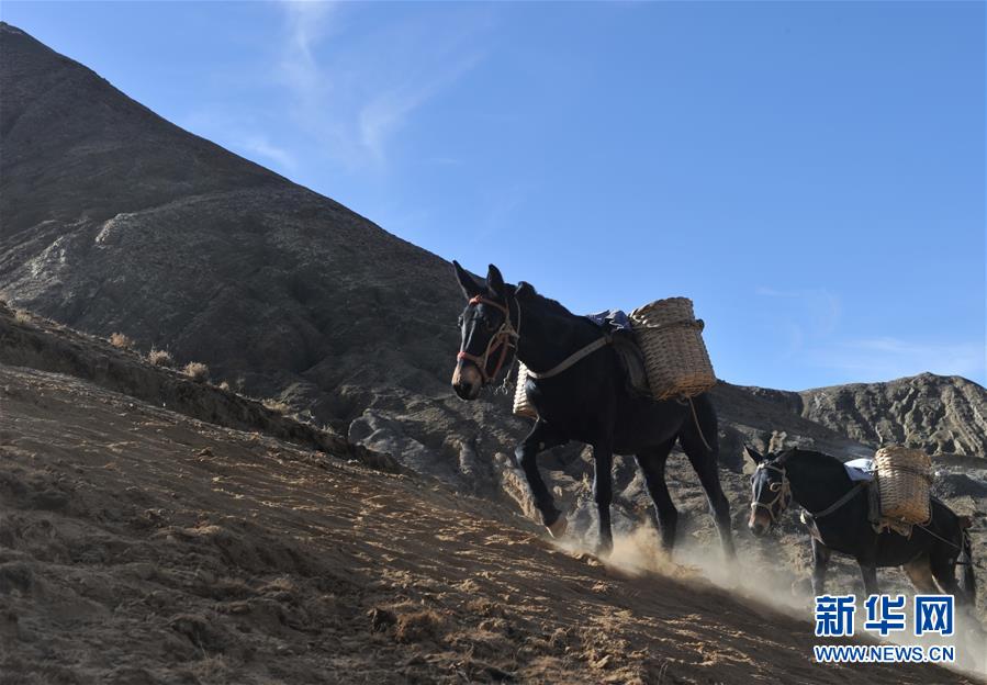 12月6日,騾馬隊馱負(fù)工程物料前往山頂塔基施工現(xiàn)場。新華社記者李楨宇攝