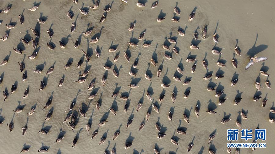 12月7日,一群候鳥(niǎo)在升金湖停留(無(wú)人機(jī)拍攝)。新華社記者張端攝