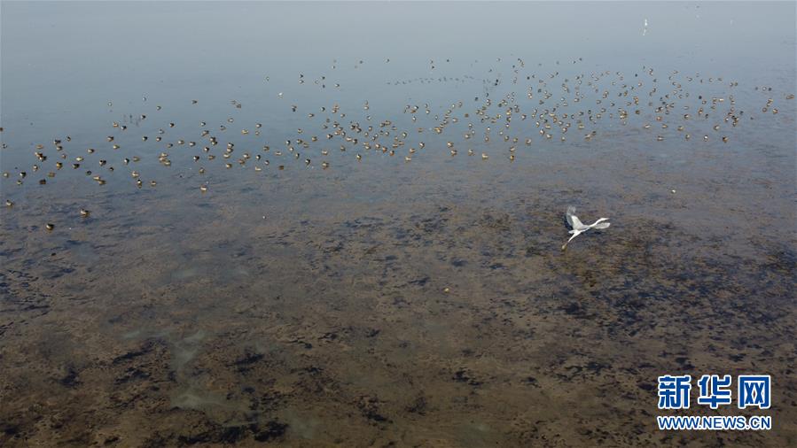 12月7日,一群候鳥在升金湖停留(無人機拍攝)。新華社記者張端攝