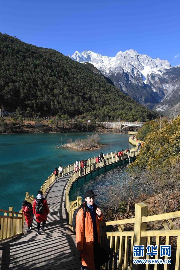 2月14日,游客在麗江玉龍雪山藍(lán)月谷游覽觀光。