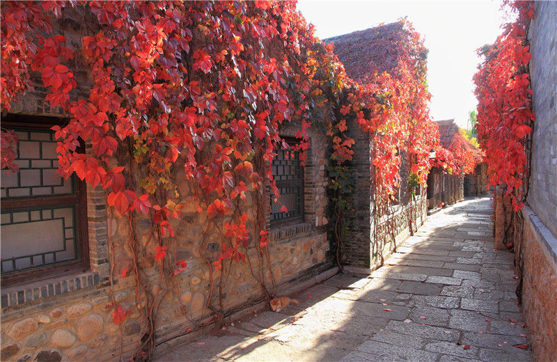 2019年10月30日,北京,古北水鎮(zhèn)秋色正濃,隨處可見(jiàn)的爬山虎蔓莖縱橫,葉子正紅,將水鎮(zhèn)變成了紅葉小鎮(zhèn),美如畫(huà)卷。