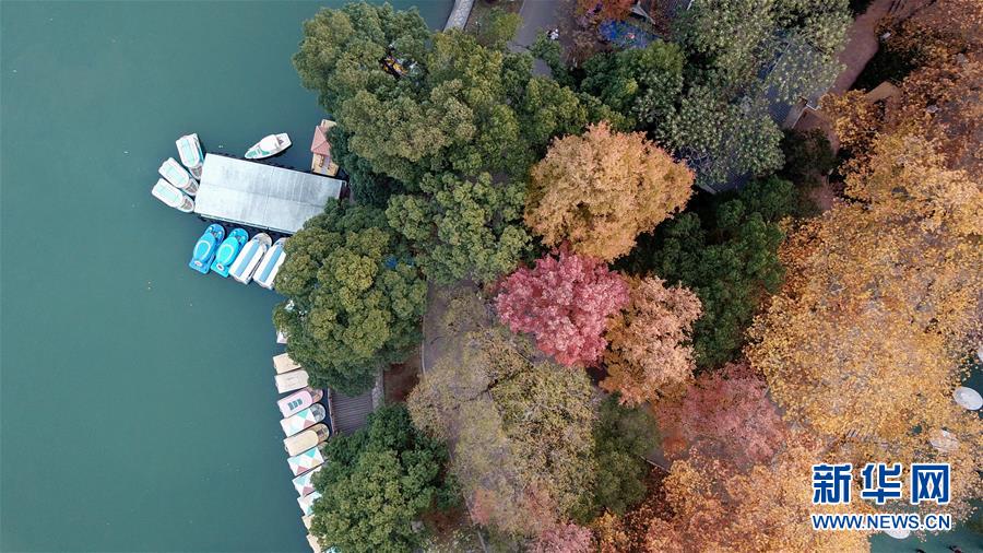 12月10日,游船停靠在湖南烈士公園年嘉湖湖畔(無(wú)人機(jī)拍攝)。新華社記者陳澤國(guó)攝