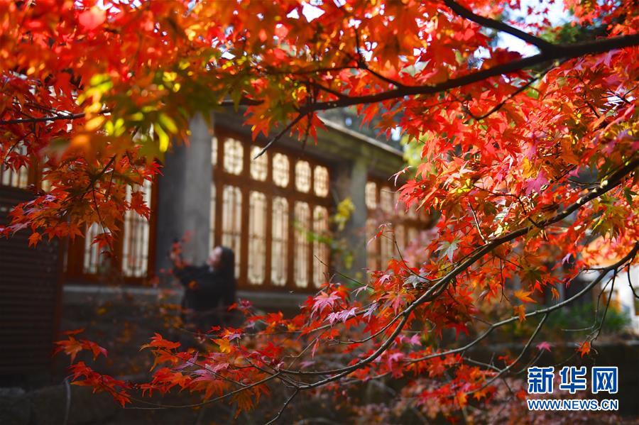 11月17日,游客在廬山如琴湖旁的房屋邊留影。新華社記者胡晨歡攝