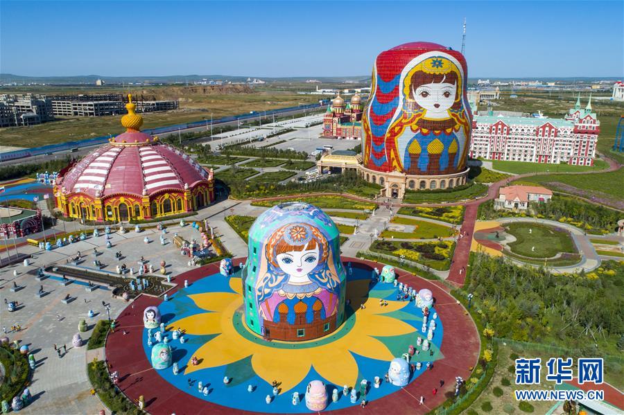 8月29日無(wú)人機(jī)拍攝的滿洲里市套娃廣場(chǎng)景區(qū)。滿洲里市位于呼倫貝爾大草原腹地。新華社記者彭源攝