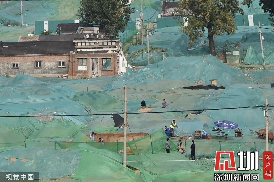 圍擋內(nèi),工地大部分被綠色苫布覆蓋,只露出幾處規(guī)整的探坑??脊殴ぷ髡哒诰o張忙碌中,有些工作人員戴著草帽,坐在馬扎上記錄發(fā)掘細(xì)節(jié),還有一些穿著藍(lán)色背心的工作人員使用工具正在做清理工作。