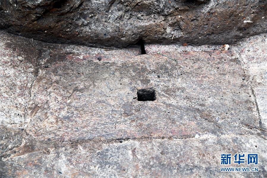 在瑯琊臺(tái)遺址考古發(fā)掘現(xiàn)場(chǎng)拍攝的秦漢時(shí)期的石砌地漏,六方大小石塊斜面壘砌,中間的石塊開(kāi)有方形小孔。根據(jù)地漏的形狀和制作的精細(xì)程度,可以初步判斷它應(yīng)該用于室內(nèi)排水(12月21日攝)。新華社記者李紫恒攝
