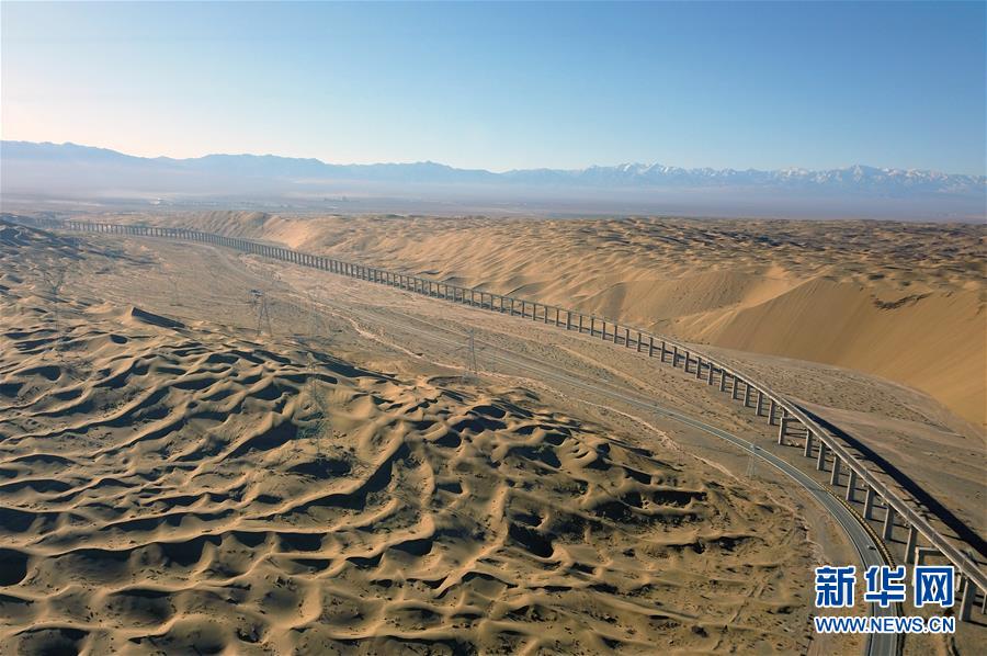 這是敦格鐵路沙山溝特大橋(12月11日無人機拍攝)。 敦(煌)格(爾木)鐵路沙山溝特大橋位于甘肅省酒泉市阿克塞哈薩克族自治縣境內(nèi)的庫姆塔格沙漠內(nèi),是一座穿越活動性沙漠地區(qū)的特長橋梁,也是敦格鐵路的重難點控制工程。據(jù)介紹,橋梁所在區(qū)域風(fēng)沙活動頻繁,四季及晝夜溫差大,在建設(shè)過程中,中鐵十一局集團有限公司的建設(shè)者根據(jù)沙層的厚度、分布及含水率的不同,總結(jié)出一套沙丘樁基施工工藝。 新華社記者 范培珅 攝