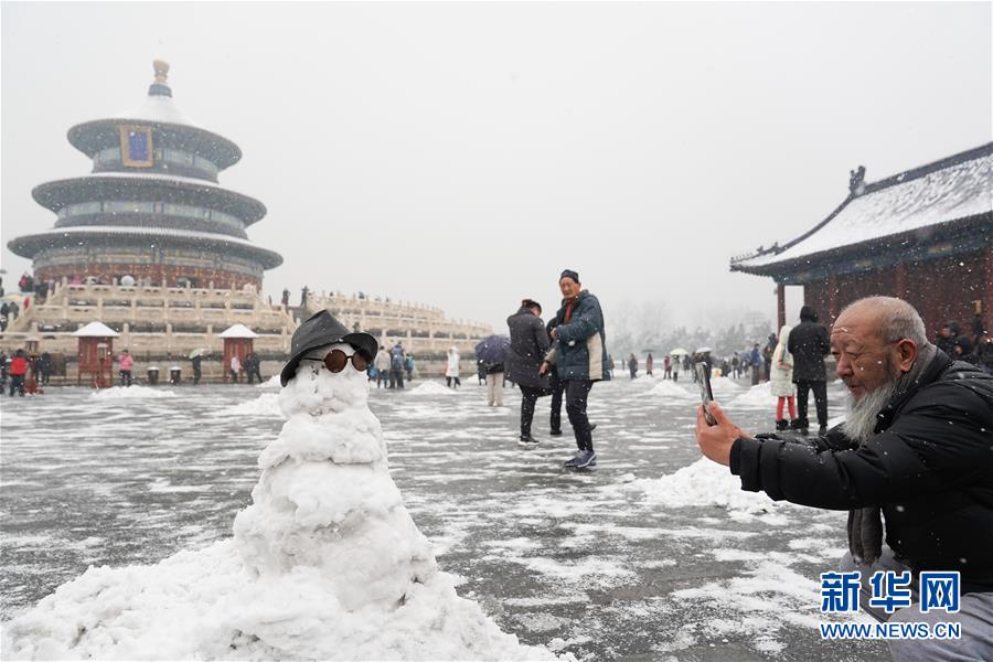 12月16日,在北京天壇公園,一名游客拍攝雪人。 當(dāng)日,北京迎來降雪天氣。 新華社記者 鞠煥宗 攝