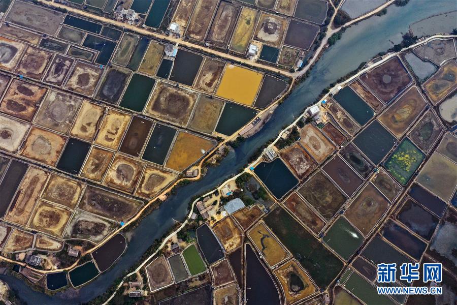 12月21日無(wú)人機(jī)拍攝的廣西合浦縣黨江鎮(zhèn)更螺圍出海口的蝦塘。冬日,廣西廉州灣海域風(fēng)光別致。新華社記者張愛(ài)林?jǐn)z