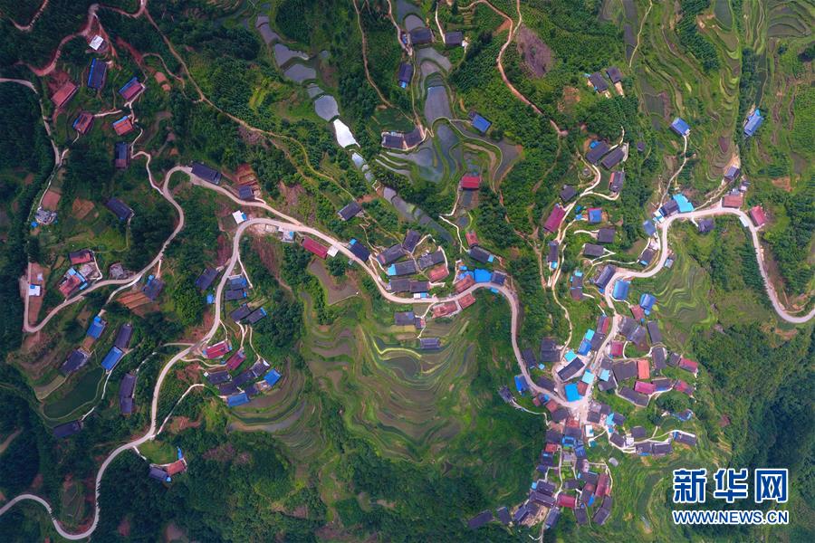 在融水苗族自治縣桿洞鄉(xiāng)黨鳩村下黨鳩屯,道路已經(jīng)修到家家戶戶門前(6月21日無(wú)人機(jī)拍攝)。新華社記者黃孝邦攝