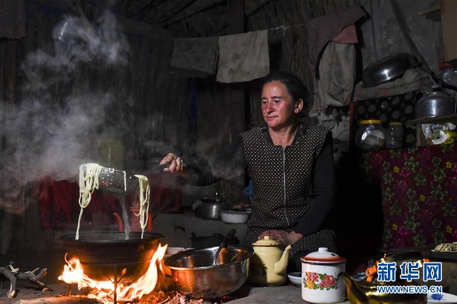 在地處塔克拉瑪干沙漠腹地的于田縣達(dá)里雅布依鄉(xiāng)5小隊(duì),依明的妻子在夜間做拌面(3月16日攝)。新華社記者胡虎虎攝