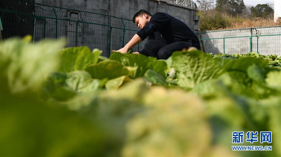 金寨火車站派出所民警呂錦鵬在菜園摘菜(12月19日攝)。由于金寨火車站派出所離縣城較遠(yuǎn),平時買菜不方便,民警們在院子里開墾了一處小菜園。新華社記者張端攝