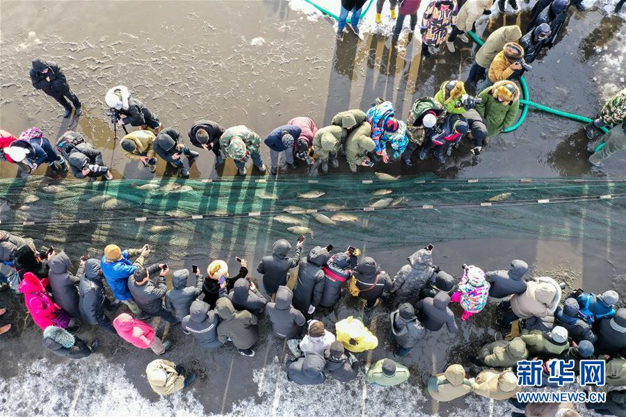 12月18日,人們在諾干湖觀看冬捕活動(dòng)(無人機(jī)拍攝)。新華社記者劉磊攝