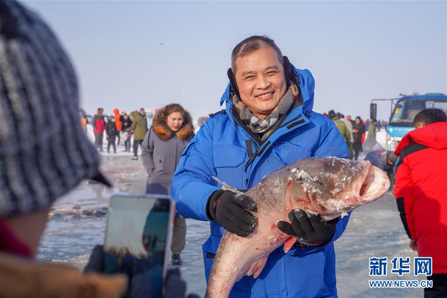 12月26日,在吉林松原查干湖冰面上,游客手捧剛打撈上來(lái)的魚(yú)拍照留念。隨著吉林松原查干湖冬捕知名度不斷提高,全國(guó)各地消費(fèi)者對(duì)查干湖魚(yú)的需求量逐年增大。2014年開(kāi)始,多個(gè)電商平臺(tái)和快遞企業(yè)紛紛抓住商機(jī)進(jìn)駐查干湖。經(jīng)過(guò)多年發(fā)展,借助互聯(lián)網(wǎng)銷(xiāo)售優(yōu)勢(shì)和日趨完善的快遞網(wǎng)絡(luò),全國(guó)多地的百姓可以在魚(yú)出水后的48小時(shí)內(nèi)品嘗到查干湖魚(yú)的鮮美滋味。新華社記者張楠攝